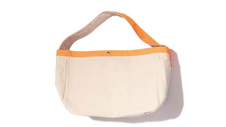 ヴィンテージのニュースペーパーバッグをもとに、短めのストラップやオレンジ配色で目新しくリデザイン。書類を平積みにしたり、お弁当を並べて収納できる。