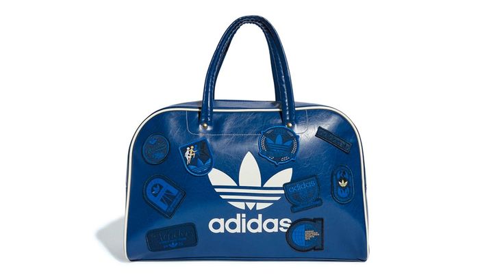 懐かしい風合いと耐久性を併せ持つポリウレタンレザーのボストンバッグ。ブルーを引き締める白のパイピングと複数の刺繡バッジが洒落感を上乗せ。