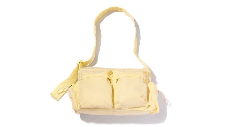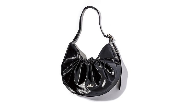 フロントのドローコードでシルエットに変化をつけられる、クロスボディの三日月形。光沢のあるナイロン製で、重厚感のある見た目なのに軽さはピカイチ。