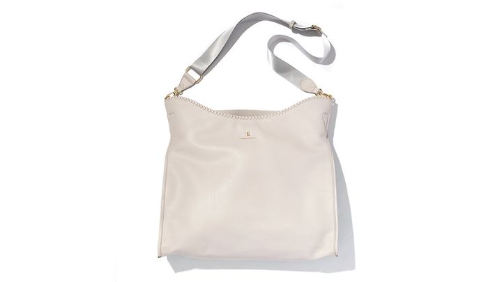 ほんのりシワ加工とギャザーがこなれたホワイト。内側にはiPadやノートがフィットするオープンポケットをはじめ、計4ポケットで整理上手に。