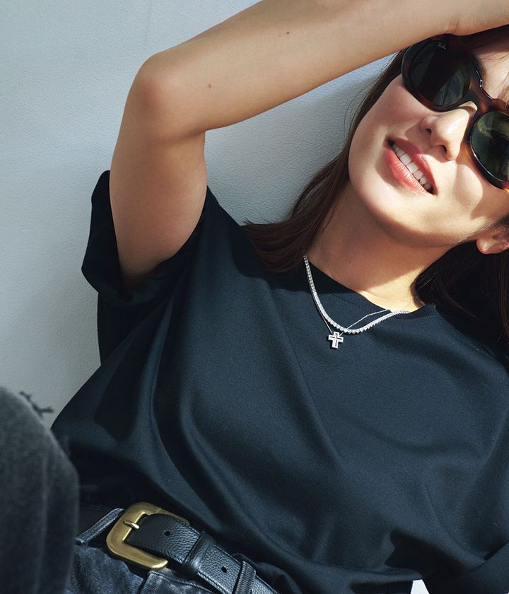 ネックレス「タイムレス クラッシコ」[WG×DIA]¥5,049,000 ネックレス「ベル エポック」[WG×DIA]¥537,900(ともにダミアーニ/ダミアーニ 銀座タワー)Tシャツ¥12,100(エブール/LITTLE LEAGUE INC.)デニム¥39,600〈アンスクリア〉ベルト¥31,900 ※参考価格〈アトリエ アンボワーズ〉(ともにアマン)サングラス¥29,480(レイバン/ルックスオティカジャパン カスタマーサービス)