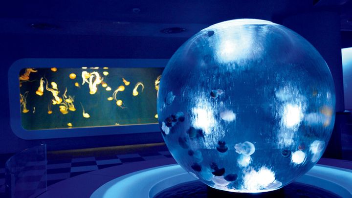 クラゲ展示70年。前身の〈江の島水族館〉が開館した1954年から展示飼育に挑み、73年に世界初の常設展示に成功した。繁殖や生態解明にも力を入れ、現在は50種類以上のクラゲを展示する。