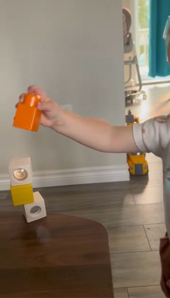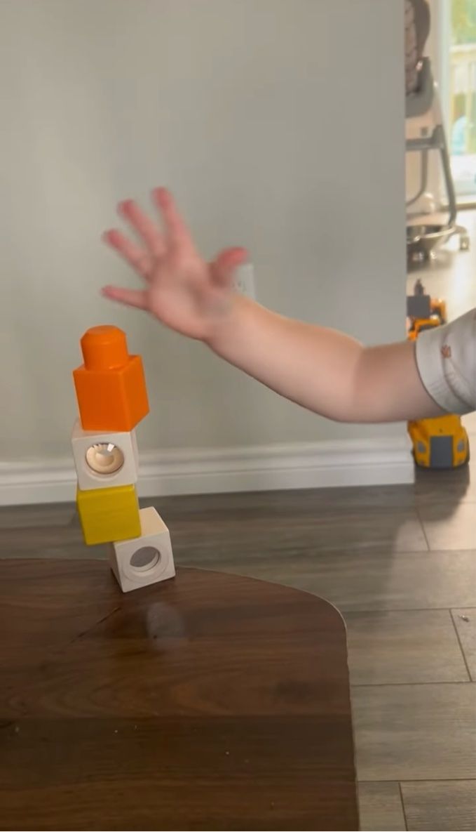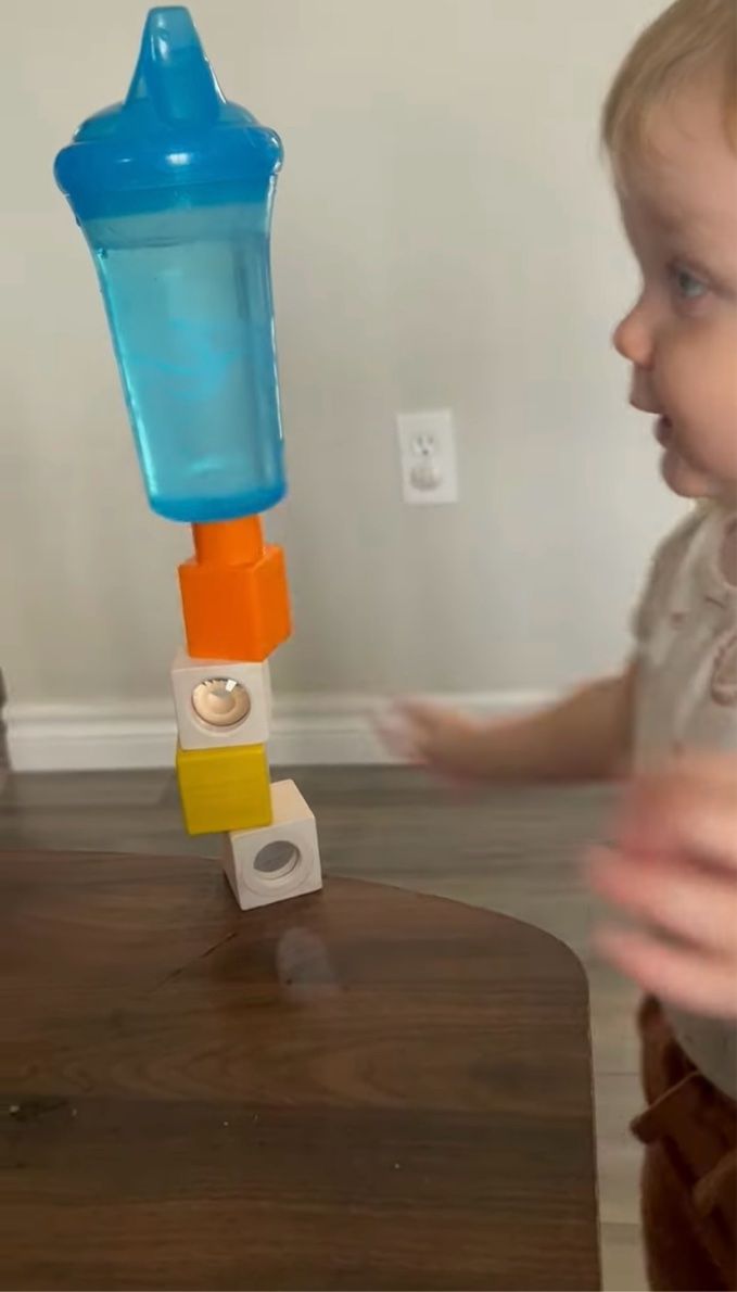 不安定なブロックタワーのてっぺんに、中の入ったマグも積み上げた1歳半の男の子。 その模様は、こちらの動画からご覧いただけます。