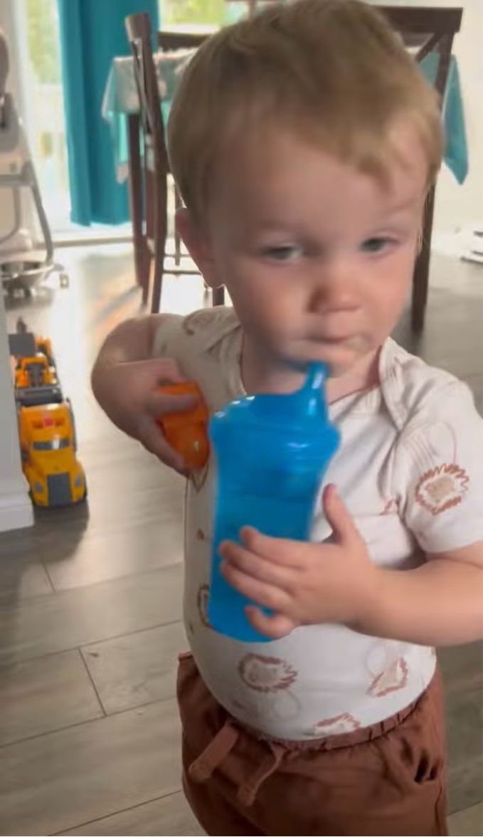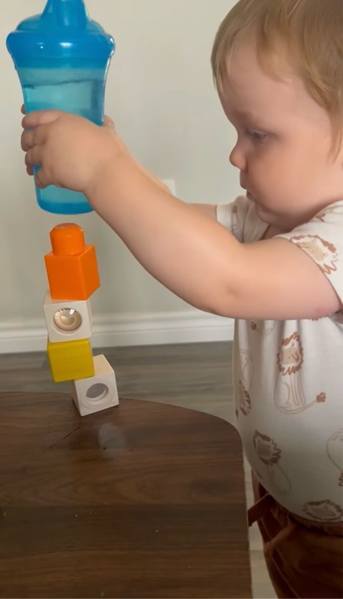 カメラの前には、1歳半の男の子の姿が。 その手には、飲み物が入ったマグとブロックが握られています。
