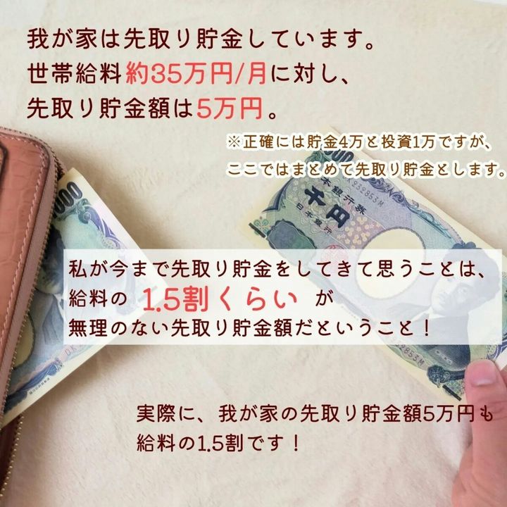 先取り貯金について調べてみると、家族構成にもよりますが収入の2割や3割が良いといった情報も見受けられました。しかし、わが家の場合は「収入の1.5割」を先取り貯金額に設定しています。