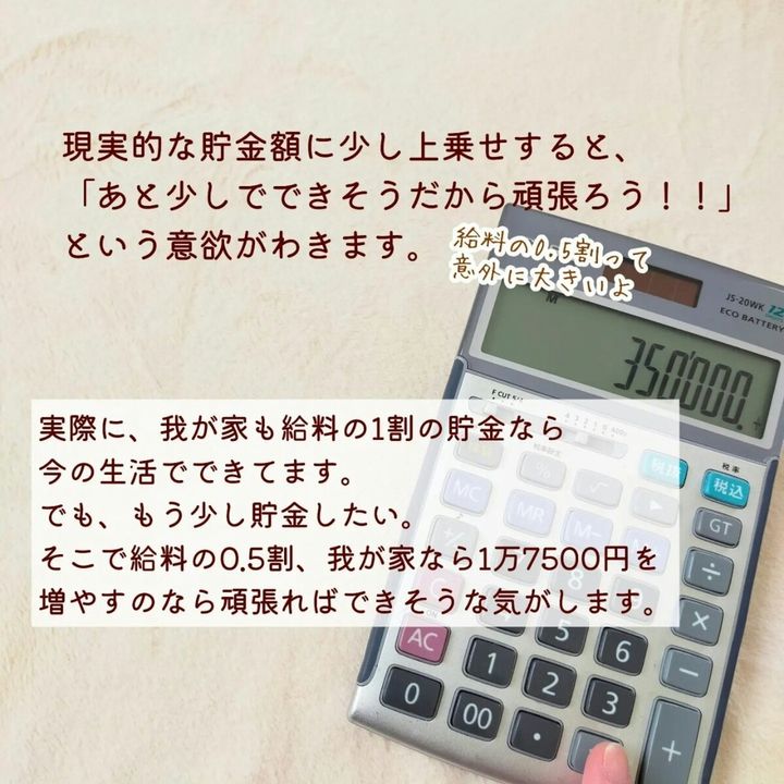 収入の1.5割というと少ないようですが、金額にすると5万2500円。収入の1割(3万5千円)よりも1万7500円増額します。このくらいの金額なら、家計の見直しや節約で貯金用のお金を確保することができそうだと思いました。