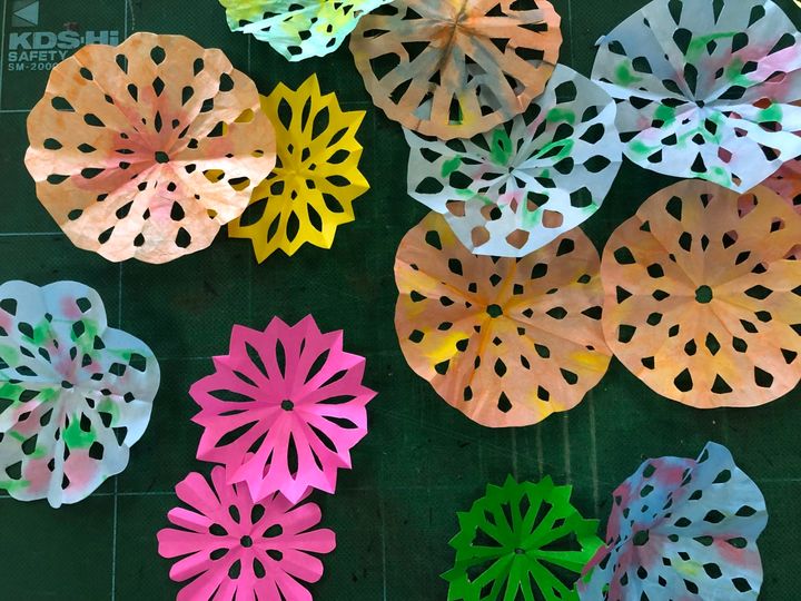 今年は、うちわにカラフルな切り紙アートを散りばめてみました。子どもたちが障子紙をさまざまな色に染め、先生が切り紙にして仕上げました。