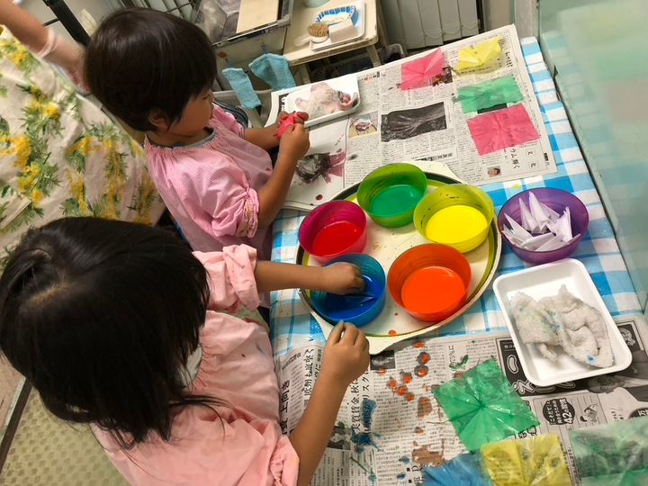 スーパーなどで市販されている障子紙をさまざまな色に染めました。すでに染め紙を何度か体験している子どもたち、躊躇せず好きな色を選んで染めています。今回は色を混ぜずに単色にしてもらうようにお願いしました。やり始めたら止まらない!その真剣な眼差しと手つきは職人のよう・・・染め上がりの紙を広げるところは先生が多少サポートしていますが、基本的には子ども任せです。