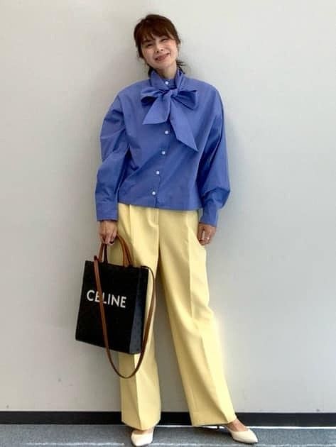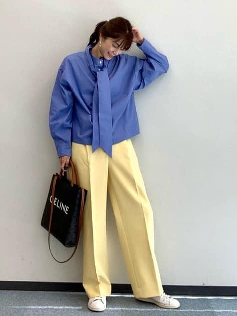 今年らしい少し短めのブラウスはスタンドカラーで前後着用可能。さらにボリュームのある共布のボウタイが何通りでも結べるので幅広い着こなしを叶えます。もちろんボウタイ無しでも可愛く着られる万能アイテムです。ブルーと好相性のイエローパンツでコーデしました。足元はヒールでもスニーカーでも◎。