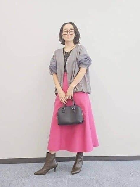 2.秋の先取りコーデに最適な「透け感グレーカーデ×ピンクスカート」