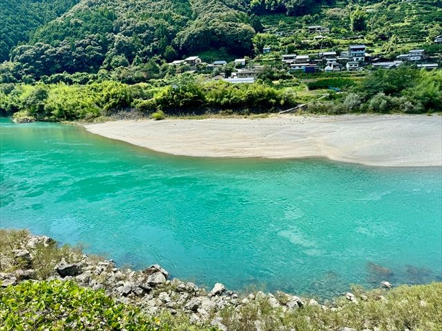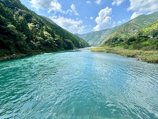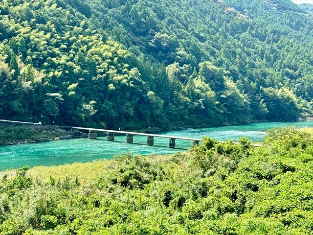 山の間を静かに流れる仁淀川。ずっと見つめていたくなる、幻想的な青です。