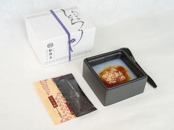 くず餅の原料である小麦澱粉を使用した生食感のくず餅。グランスタ東京店オープンに合わせ、約1年かけて開発されました。くず餅は発酵小麦澱粉を蒸し上げて作るのに対し、「とろり」は発酵小麦澱粉に長時間熱を入れて練り上げ冷やし固めます。口に入れると溶けてしまうようなとろ~りとした生食感のため、「とろり」と名付けられたとか。付属の黒蜜はくず餅乳酸菌入りなので、身体へのやさしさが染み渡る新食感和スイーツとなっています。開けるのがワクワクするような高級感のある箱・パッケージで、手土産にもぴったり。