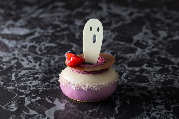 ウィッチポット ¥756刻んだ栗とカシスのクレームブリュレを包み込んだ、おばけが飛び出る可愛らしいデザインのマスカルポーネのムース。甘みと甘酸っぱさのマリアージュが絶妙な仕上がりです。周りにあしらったココナッツ、飾りのチョコレートが食感にアクセントを添えます。