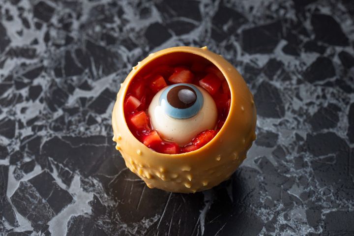 イービルアイ ¥756リアル過ぎるビジュアルがいたずら心溢れているムースケーキ。ほのかな塩味がアクセントのブロンドチョコレートの器の中には、洋梨のゼリー、ブロンドチョコレートのムースやガナッシュが層になっています。仕上げに苺とフランボワーズのジュレを重ねて瑞々しい味わいに。