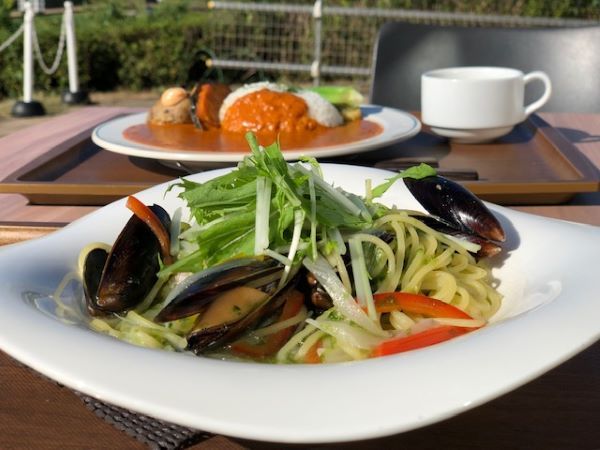 この日のパスタは、『ムール貝と生海苔のペペロンチーノ』。海の幸とシャキシャキの水菜の相性がばっちりで、生海苔の風味が本当に美味しかったです。お天気が良く、テラス席でまったりと食事しました。デザートには、フロートを選んで大満足☆手賀沼と青空をながめながら、リラックスした時間を過ごせました!