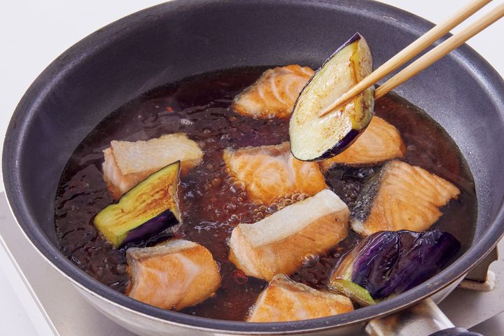 3. 揚げないから簡単!甘辛煮汁がしみしみの『鮭となすの南蛮煮』レシピ【食材2つ】