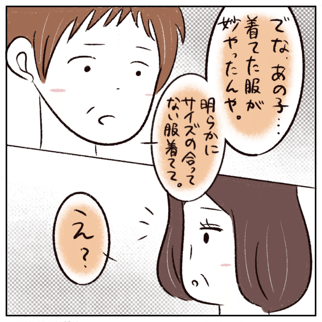 そして、「でな、あの子・・着てた服が妙やったんや。明らかにサイズの合ってない服着てて」「え?」まるさんのお母さんがそう言うと、前田さんは驚きました。