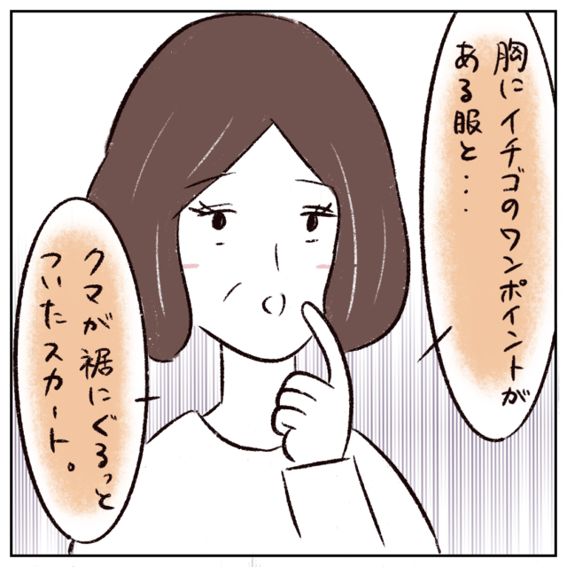 そして、「胸にイチゴのワンポイントがある服と・・クマが裾にぐるっとついたスカート」と答えた前田さん。