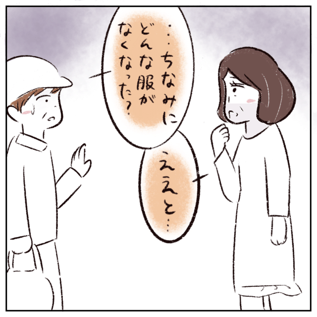 「・・・ちなみに、どんな服がなくなった?」「ええと・・」まるさんのお母さんが前田さんにたずねると、考え込む前田さん。