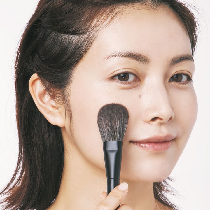 1.チークをブラシに取り、黒目の下から耳の上下に向かって三角形にボカすとふっくら血色&陰影に。