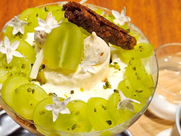 パフェの主役はもちろん「シャインマスカット」で、そのフレッシュな美味しさが際立っていますが、パンナコッタやヨーグルト風味のシャーベット、エルダーフラワーのジュレ、黒糖のシガールなど、各素材の美味しさにも感激します。 シャインマスカットを引き立てながら、それぞれの素材の美味しさとのマリアージュを存分に楽しめます。甘すぎず、味変を思わせるような素材の豊富さ、全体のバランスも最高で、夜間でもすっきりといただける極上の美味しさです。