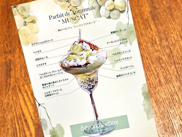 美しいパフェを、芝公園のカフェ「ビヨンド ザ ボックス」で、夜の時間帯の21:00まで(日祝ま20:00まで)食べることができます。シャインマスカットのパフェは、季節限定のメニューです。※提供期間:2024.09.04〜2024.10月中旬予定 ※事前に電話にて取り置き可能
