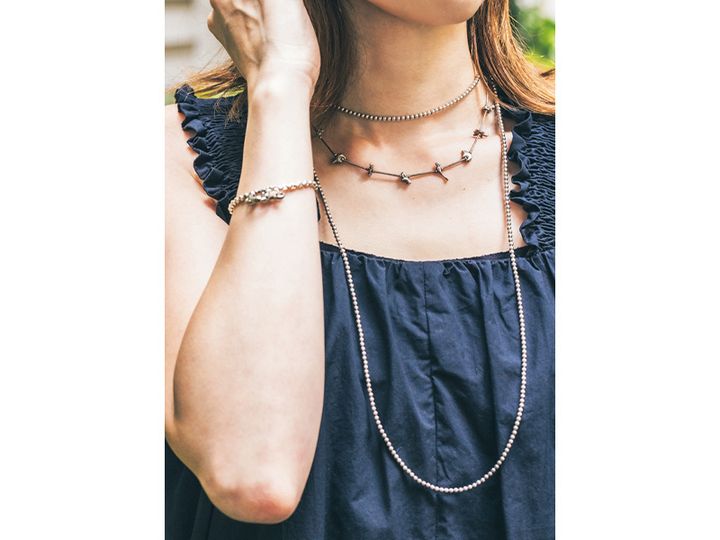 ジュエリーもロンハーマンがセレクトしたものをコレクション。特に好きなのは、カジュアル服に馴染むシルバーアクセサリー。最近はHARPOの動物モチーフとナバホパールネックレスのレイヤードが気分。世界各地のセンスのいいジュエリーを知れるのも、ロンハーマンの良いところ!