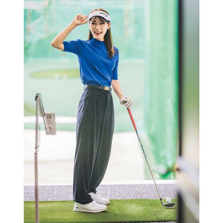 打ちっぱなしへは、トレーニングウェアの日もあれば私服で行くことも。アルアバイルのハイネックトップスできちんと感を出しつつ、スタニングルアーのゆるパンツで機動力を担保します。ベルトはミュウミュウ。