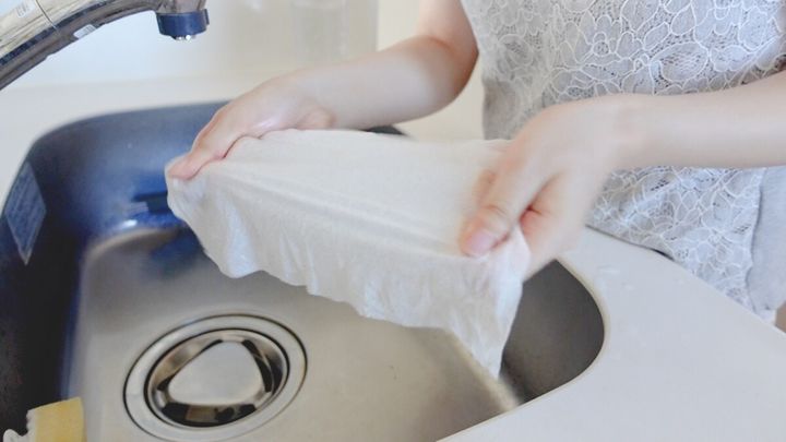 触り心地もキッチンペーパーとは違い、しなやかな素材感。材質はパルプとポリプロピレンです。30枚入りで100円(税抜)ですが、洗って2~3回、いや、汚れ切るまで繰り返し使えて、コスパがすごくいいですよ。