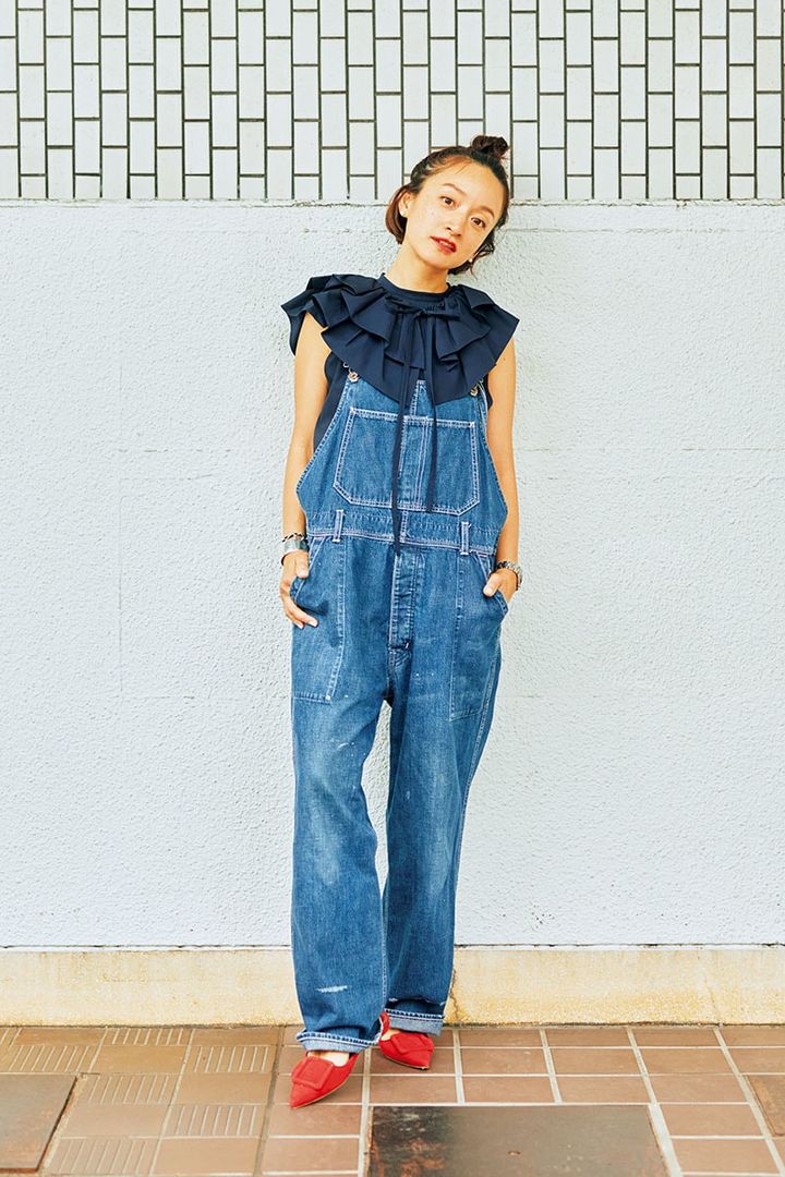 大人のオーバーオールは小物でドレスアップ