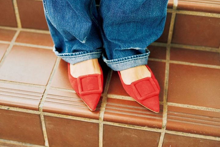 マノロ・ブラニクのミュール|大人の赤を効かせてラフすぎない装いに 【大人女子の足もとおしゃれ】