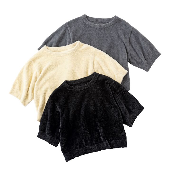 フワフワな手触りが気持ちいい毛足の短いシャギーニット。身頃、袖ともにゆとりがあり、体に張りつかないのも嬉しいところ。手洗い可。表情豊かなシャギー素材が、おなじみのニットコーデに新鮮味を与えてくれます。短か丈のシンプルデザインもスタイリッシュ。
