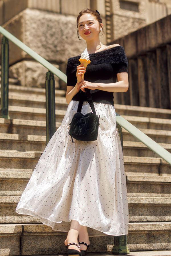 光沢感のあるドット柄オーガンジ ーを使用したティアードスカートが、驚きのアンダー¥2,000。トップスに秋を感じるファー付きのオフショルニットを合わせて、モノトーンスタイルに表情をプラス。