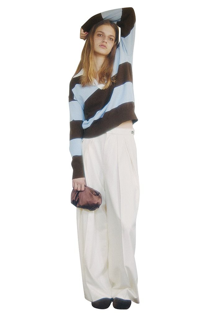 ワイドボーダーにブラウンが混ざることで、キャッチーに転ばずシックにまとまる。身ごろはゆったりとしつつ丈が長すぎないので、ワイドパンツやフレアスカートとバランスがとりやすい。茶×水色ラガーニット/WRAPINKNOT × SHIPS(シップス インフォメーションセンター)
