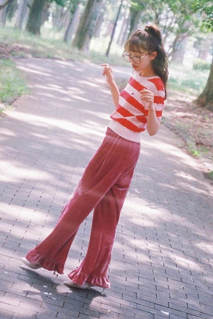 ボーダーニット 9,530円/KIRSH(KIRSH TOKYO FLAGSHIP STORE)ベロアパンツ 12,100円/レイ ビームス(レイ ビームス 新宿)メガネ 20,240円/COACH(ルックスオティカジャパン) リボンミュール 9,900円/RANDA