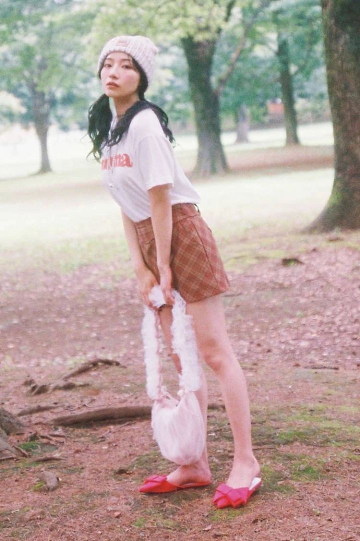 チェックスカート 4,620円/ウォルイル(スピンズ) ロゴTシャツ 5,000円/NORMA JEANS BLU ニットビーニー 11,000円/UGG®(デッカーズジャパン) パールネックレス 14,040円/アビステ チュールバッグ 6,790円/NADIA FLORES EN EL CORAZON リボンバブーシュ 2,640円/神戸レタス