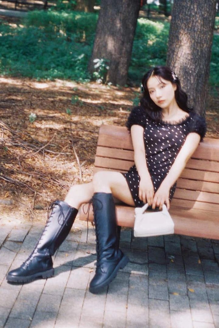 ピタピタ×フリルでぷりかわ要素満点。甘々なミニワンピと、ギャルみの強いレースアップブーツのバランスが◎。