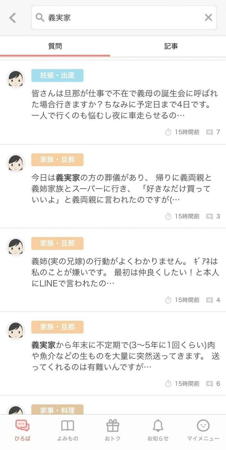 アプリで検索をすると、他の義実家にまつわるエピソードを調べることができます。自分から悩みや聞きたいエピソードを投稿することも可能です。