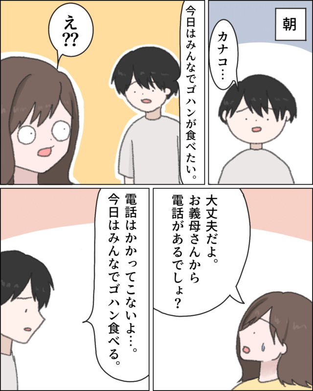 ユウタさんだけ別で食事するようになってしばらく経ったある日、ユウタさんが「カナコ・・・今日はみんなでご飯が食べたい。」と言ったのでカナコさんは驚きました。「大丈夫だよ。お義母さんから電話があるでしょ?」夕食の時間を伝えているので、義母はまたいつものように電話をかけてくると思っているカナコさんですが、「電話はかかってこないよ。今日はみんなでご飯食べる。」とユウタさんは言いました。