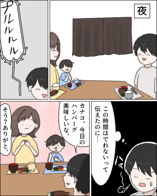 電話に出ずに、ユウタさんは「カナコ、今日のハンバーグ美味しいな。」家族団らんです。