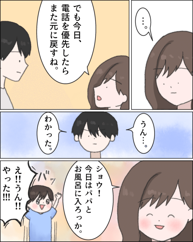 「でも今日、電話を優先したらまた元に戻すね。」少し考えた後、カナコさんが念を押すと、「うん、分かった。」と、ユウタさんが真剣な顔でこたえたので「ショウ!今日はパパとお風呂に入ろっか。」とカナコさんは笑顔で言いました。ショウくんも大喜びです。