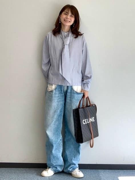 取り外しできるボウタイでいろんな着こなしができる秀逸ブラウス。今年らしい少し短めの丈で前後着用可能なスタンドカラー。そしてボリュームのある共布のボウタイが何通りでも結べるのでさらに着こなしの幅が広がります。今回はネクタイ結びにしてワイドレッグのカジュアルなデニムとスニーカーでボーイッシュなカジュアルコーデに。他にもボウタイの結び方次第でキレイめにもなり、いろいろとコーデを楽しめます。