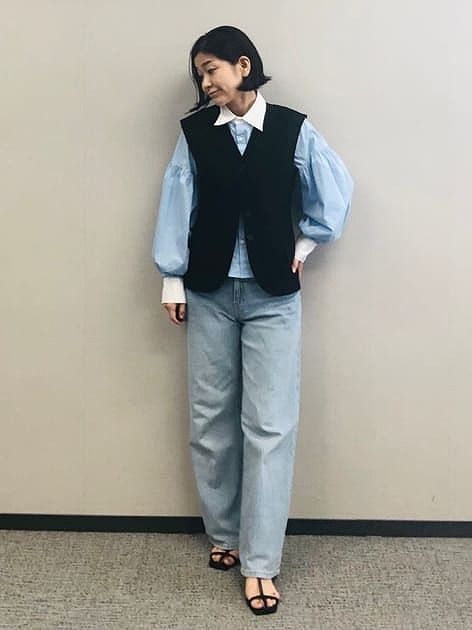 1.「爽やかブルー×黒ジレ」で甘カジュアルに