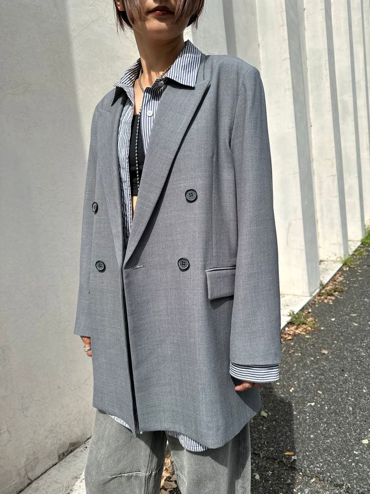 「メンズライクなスタイリングが好みなのでジャケットはよく取り入れます。今回はグレーを選び全体的にトーンをまとめつつ、ヘルシーな肌見せも取り入れることで、かっちりしがちなジャケットスタイルにほどよいヌケ感を出すよう意識しました。スタイリングに合わせて、久しぶりのロングヘアもラフにまとめています」