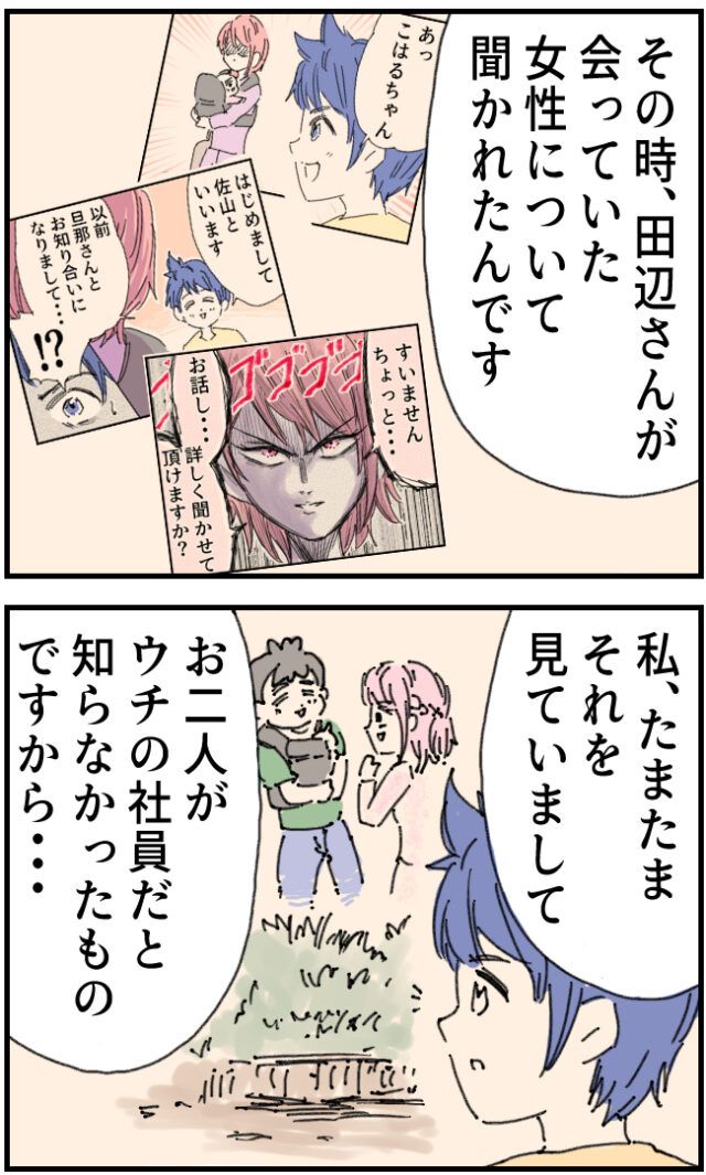 いちろうさんと白石さんが公園で話しているのを見かけた当時の佐山さんは、2人が自分の会社の社員だとは知らなかったので