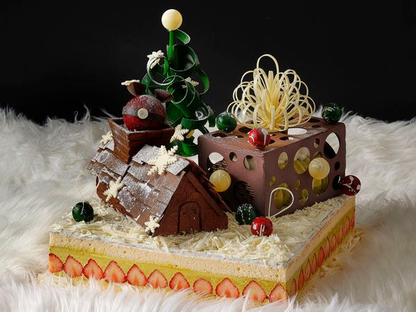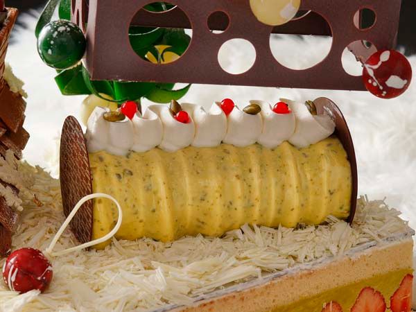 イタリア産ピスタチオのプラリネを使ったフレジェの上に、ライチゼリーとグロゼイユ(赤すぐり)を包んだ香ばしい自家製ピスタチオプラリネの濃厚ムースケーキをのせてあります。そのムースケーキに、大きなプレゼントをイメージしたチョコレート細工をかぶせて、パーティーに花を添えてくれます。