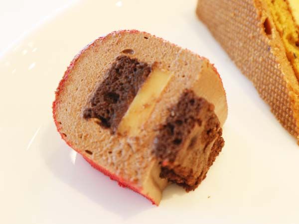 濃厚なビターチョコレートのムースはほのかにコーヒーの風味が。中にはクレーム ブラッドオレンジとガトーショコラが入っていて、満足度の高いケーキです。