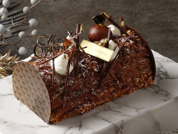 クリスマスケーキの定番ブッシュ・ド・ノエルをイメージしたこのケーキは、表面の熊本県産和栗を使ったクリームと焼き栗シャンティが特徴。中には洋梨とマンゴーのジュレ、ベルガモットムース、チョコレートのビスキュイが忍ばせてあります。