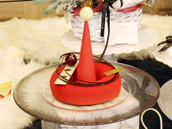 赤いカカオが全体を覆って、まるでサンタの帽子のような真っ赤なケーキ。テーブルに置くだけで華やかさを演出できます。帽子のつばの部分は、チョコレートムース。