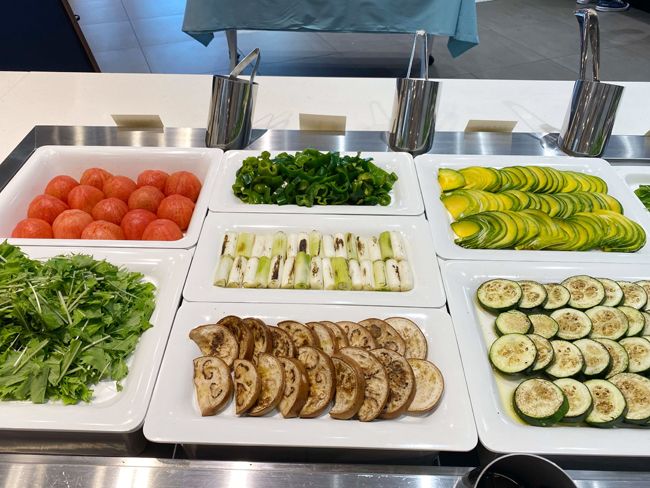 メニューは、「選べるメインとビュッフェのスペシャルランチ」と、メイン料理なしの「ビュッフェランチ」の2種類。どちらもビュッフェメニューが楽しめます。まずは、生産者の顔が見える鮮度抜群のこだわり野菜がズラリと並ぶサラダバーへ。週替わりで約10種がそろい、生で食べられる“すずかぼちゃ”や、とろーり食感の“白なす”など、普段はお目にかからない野菜にも出合えます。